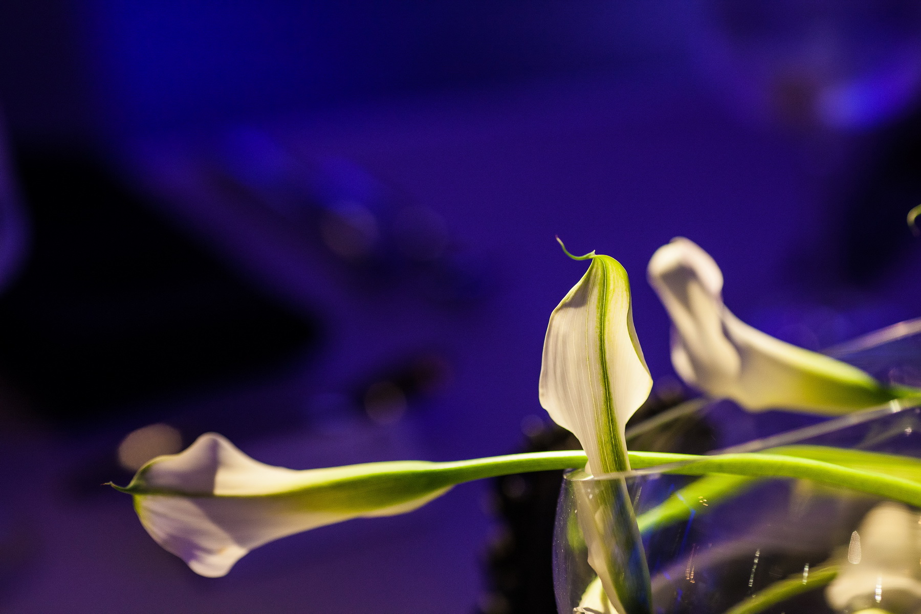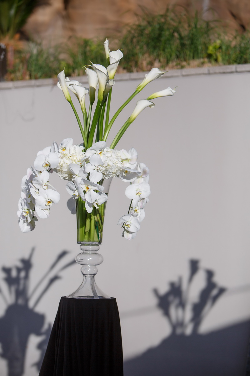 White draped material adorned the ceremony site, along with all white floral of Calla Lilies and Orchids. A photo booth and a cigar bar added to the fun, along with a candy desert table at the reception.